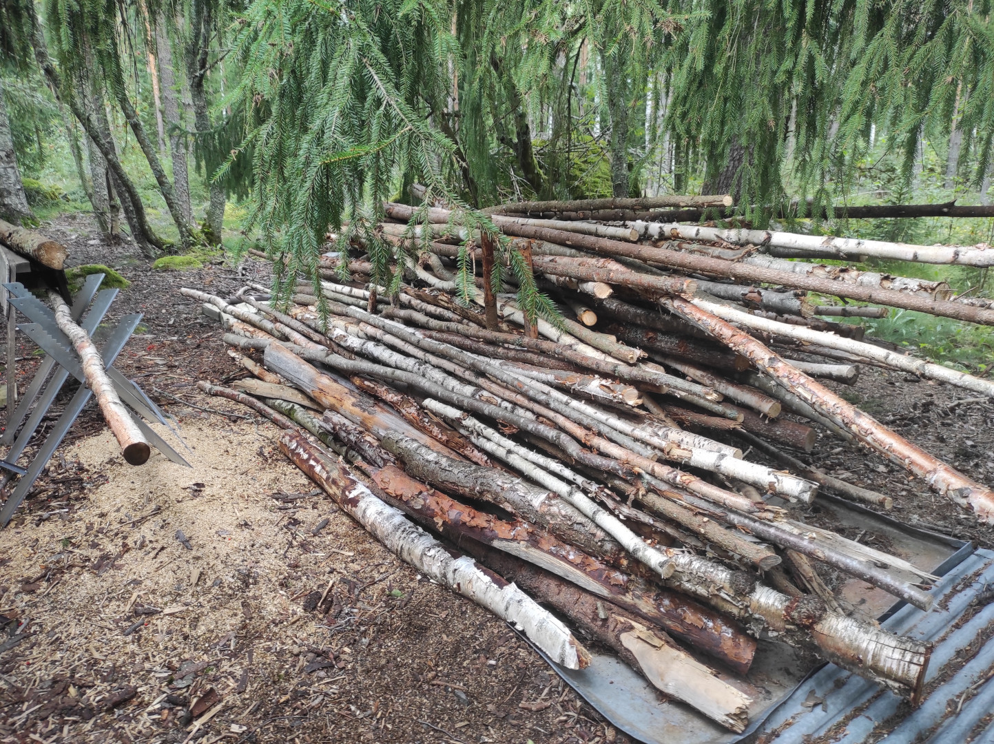 Jussin jälkeen kaadettuja, oon karsinut ja läjännyt monena päivänä. Tuo vanhan äijän päivän läjä on vaan kovin pieni.Ilmeisesti oli hyvä aika kaataa, puun kuivumisen kannalta, huono juurivesojen kasvamisen kannalta? Kun koivutkin on vesoneet mahottomasti.