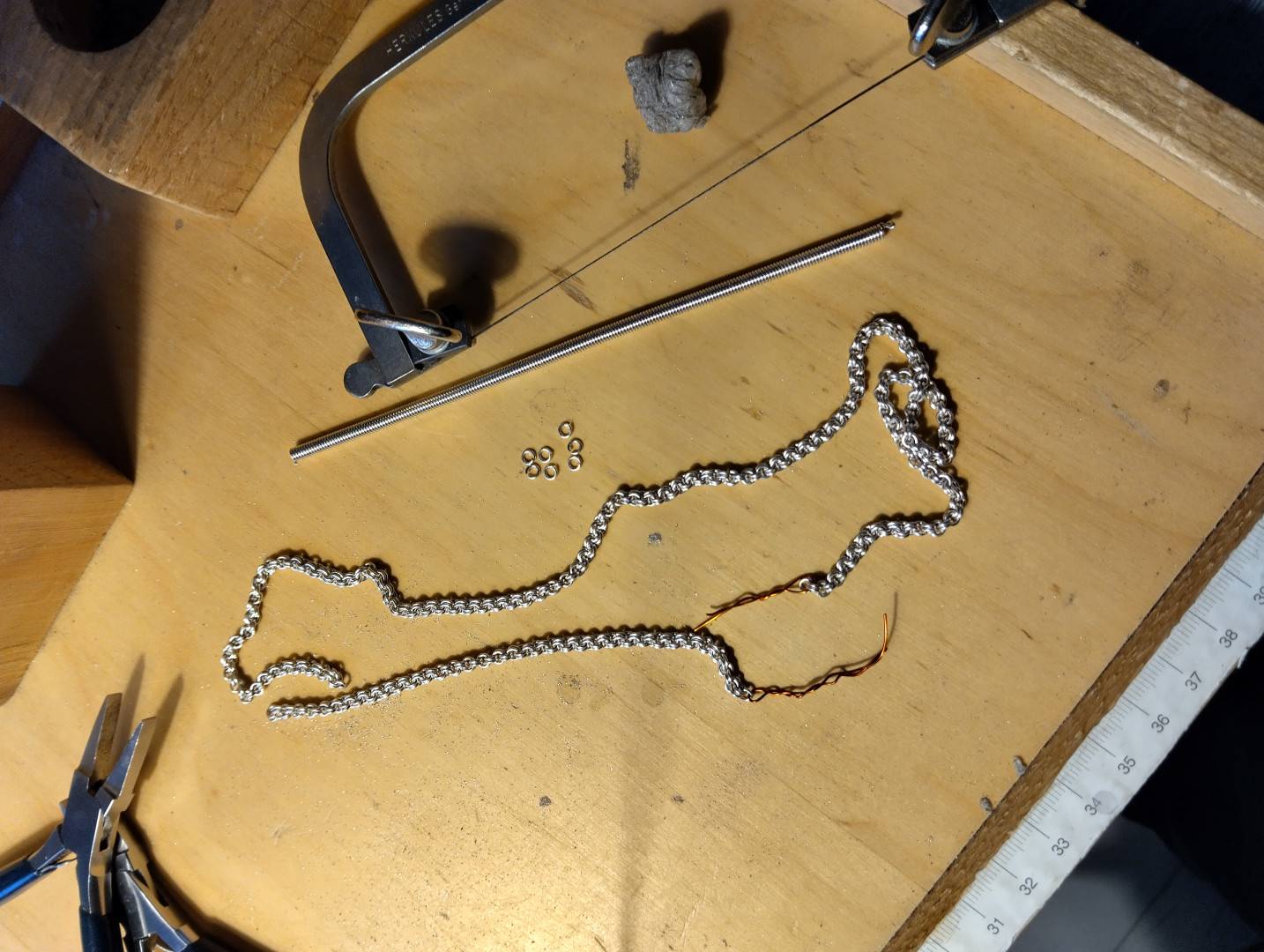 Hopea hommia pitkästä aikaa,lanka on 0,7mm ja lenkki on 2mm, muinaisketju. Olivia 6v. Toivoi joulupukilta kaula-ranne ja nilkka ketjun sekä korvikset. Aika hidasta tehdä,tunnissa valmistuu vajaa 10 cm .