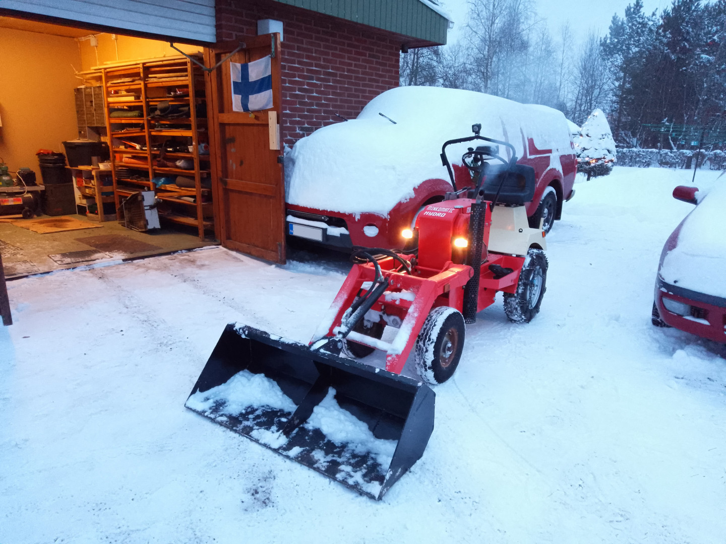 Lumitöiden vuoksi herätelty minkomaatti käyntiin joka on isäukolla ajossa  :) Kätevä laite pikkuisella okt-pihalla