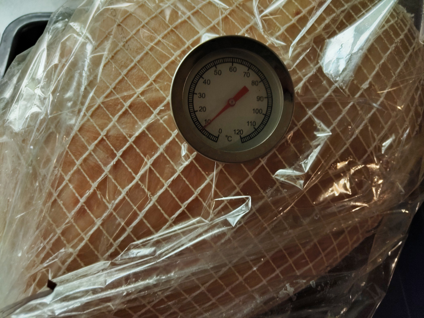 Meillä syödään ylikypsää kinkkua, en edes mittaria käytä vaikka sellainen löytyykin. Periaatteella kilo per tunti harmaa suolattu ja potkalla sen täytyy olla.