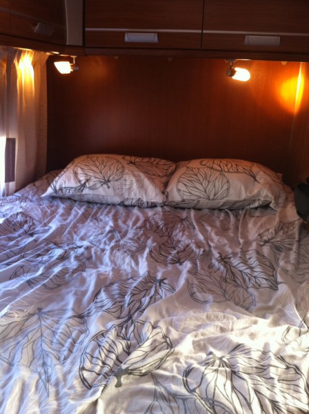 Yön yli lämmitettyyn Tessuun pedattu puhtaat vermeet. Villasukat odottaa kylmiä öitä varten.