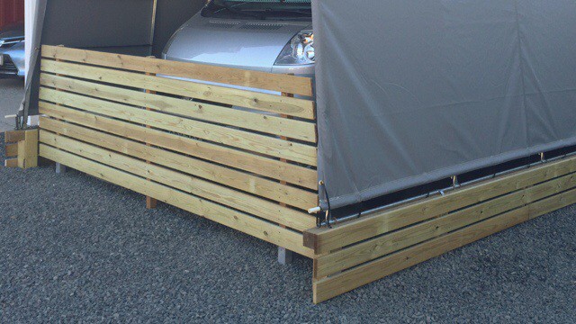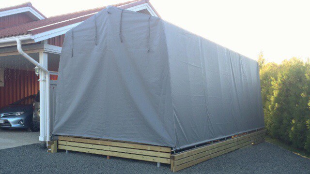 Eipä se teltta vielä täysin valmis ollutkaan, pitihän siihen vielä saada tuulensuoja tehtyä. Nyt saa talven lumimyräkät tulla, ei pitäisi tuulen päästä telttaa heiluttelemaan ja saa autokin olla rauhassa "katseilta", niin ja ei pääse edes pölyyntymään pesujen välillä.  ;D