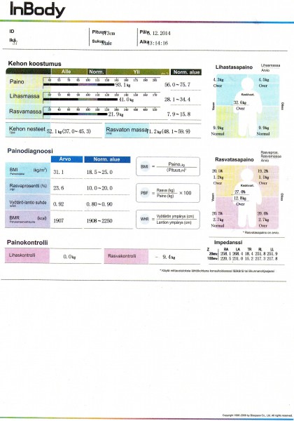 Ja jos tuosta paperista oikeen ymmärsin, niin ilmeisesti vielä 9.4 kg pitäis laihtua, siinäpä sitä ens kesäks tavotetta  ;D