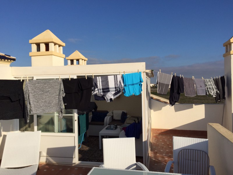 Ollaan tehty lähtösiivousta. Pasi imuroi ja moppasi ja mä istuin katsomassa, miten illalla pestyt pyykit kuivuu auringossa. Huomenna aamusta kentälle. Kotona ollaan joskus aamuyöstä keskiviikkona. Onneksi vasta iltavuoroon meno.