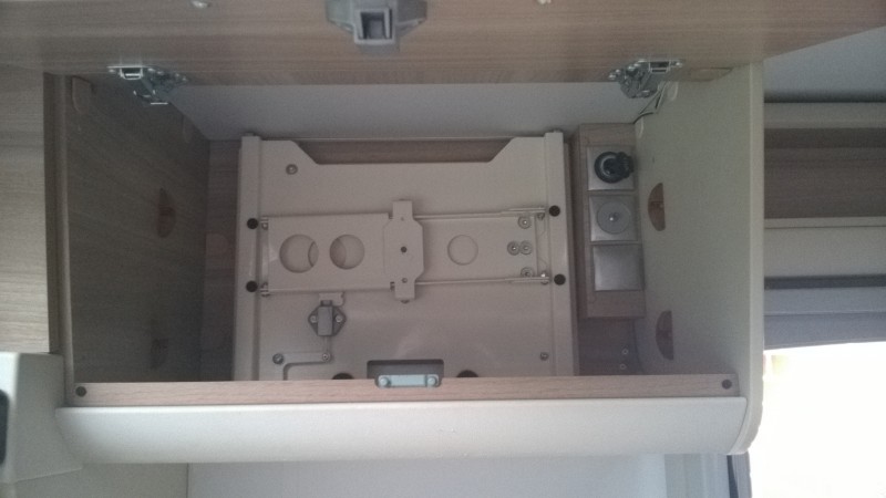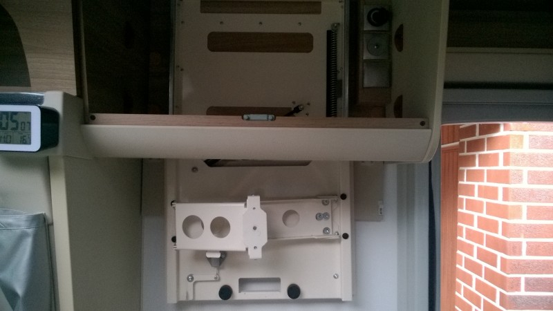 Vaikka ainakaan tässä vaiheessa Adriaan ei televisiota tulekaan, niin ihmetellyt sinne laitettua tv-telinettä. Sen toiminnan keksin, mutta kiinnitystä televisioon täytyy ihmetellä. Se kun mielestäni ei ole mikään standardikiinnitys. Lieköhän siihen jokin sovituspalikka saatavissa jostain. Tässäpä kuvia: Ensin tv-kaappi ![]() Tv-kaappi auki ![]() Suojaseinä poistettuna ![]() Teline katseluasennossa. Tuossa näkyy kiinnitys telkkariin. Se ei ole Vesa-standardin mukainen, ruuvien välikin n. 85mm kun Vesassa 75mm ja neljä kpl ruuveja. ![]() Niin se on tuollainen, laskeutuu alas. Ihan on uus tuttavuus tuo.