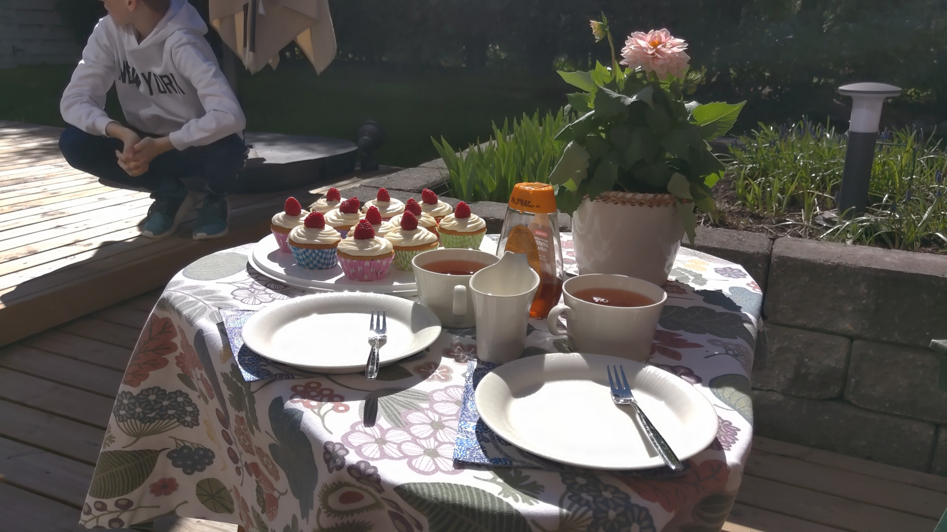 Sitten kävimme päiväkahvilla toisella tyttärellä. Pihalla mukava istuskella ja nauttia antimia.
