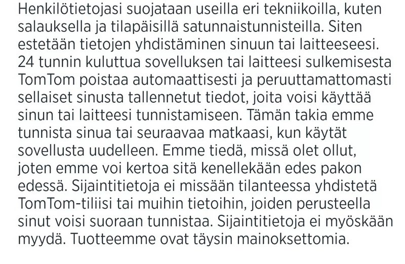Nyt jo parina aamuyönä peräkkäin appi pimputtaa jo näytölle tulee jonkinlainen ohjeteksti. Viimeksi pyysi merkkaamaan koti- ja työpaikan sijainnin. Mistään asetuksista en ole löytänyt ruksattavaa, jotta tämän ominaisuuden saisin pois. Illmaista lounasta ei ole. Näinhän tämä(kin) menee, että sovellus ei ole ilmainen, vaan siitä maksetaan omalla yksityisyydellä, mikäli rahaa ei liikutella. Väsytystaktiikalla käyttäjät kertovat ennemmin tai myöhemmin kodin, työpaikan yms. sijainnit. Online käytön myötä seurataan missä sinä, muut käyttäjät ja massat liikkuu, kulkeeko liikenne, jne. Yksittäisen ihmisen tiedot ei yleensä ole arvokasta, mutta iso tietomassa tekee haltijastaan arvokkaan, jopa kiinnostavan kaupan kohteen. Tiktoksukupolvi sanoo tietenkin, että "mitä sillä on väliä, jos joku seuraa mua..". Vanhemmat sukupolvet voi hetken pyristellä vastaan, mutta muuta ei voi.  Mutta joo, takaisin alkuperäiseen aiheeseen. AmiGo on mukava, ettei tarvi tietää tarkkaa osoitetta, vaan minne on menossa. Samaan tapaan kuin Google Maps. No, kumpi parempi - ei vielä osaa sanoa. Etuna Amigossa on nopeushäly.