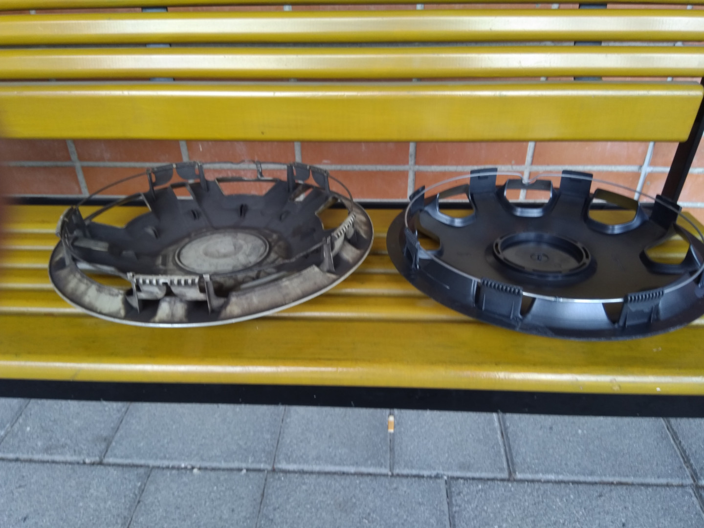 Tässä vielä kuva molemmista kapseleista kuvattuna niin, että venttiiliaukko on kamerasta poispäin. Tasapainotuspaino on venttiiliä vastapäätä. Kuvasta näkee ainakin sen, että siinä kohdassa kapselit ovat erilaisia. Vasemmalla on Fiatin kapseli, jossa kiinnityslevyke näkyy vaaleana sahalaitaisena. Oikealla on uusi tarvikekapseli, jossa kiinnikemuovit ovat mustia ja kapeampia. Venttiiliä vastapäätä eli lähinnä kameraa Fiatin kapselissa on kiinnityslevyke, toisessa ei ole.