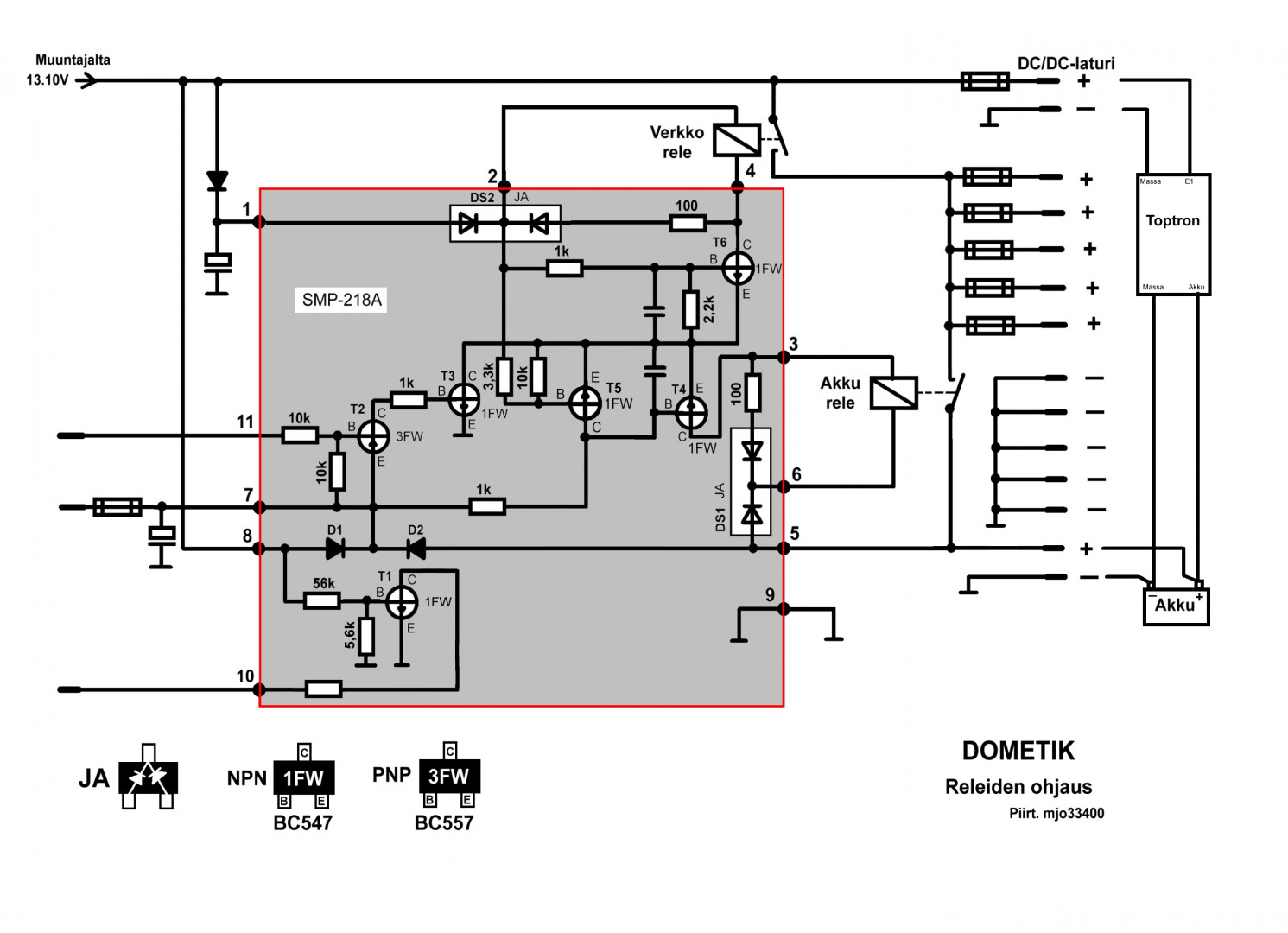 Alimmainen 15a sulake oli kärvähtänyt. Vaihdon jälkeen truman puhallin ja vessan huuhtelu alkoi toimimaan. Kortin tyyppi on toptronic EL430-BKT060002276. Googlesta ei apua ole kortin suhteen. ![]() Vaunun käyttö-ohjekirjasta löytyy kuva ko. piirilevystä.