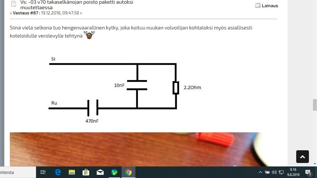 Volvovoorumilla kerrotaan että tällainen vehje pitäs rakentaa johdon päähän. Auttakaa kun en tiedä näistä mitään että rakentuuko tuo näistä komponenteista https://www.partco.fi/fi/elektroniikan-komponentit/passiivit/kondensaattorit/keraamiset-kondensaattorit/kerkot-50v100v/5512-kerkom-470n-50v.html?search_query=470nf&results=18https://www.partco.fi/fi/elektroniikan-komponentit/passiivit/vastukset/metallioksidikalvovastukset/metallioksidivastukset-1w/12664-vastus-1w-2r2.htmlhttps://www.partco.fi/fi/elektroniikan-komponentit/passiivit/kondensaattorit/keraamiset-kondensaattorit/kerkot-500v/5500-kerko-10n-500v.html