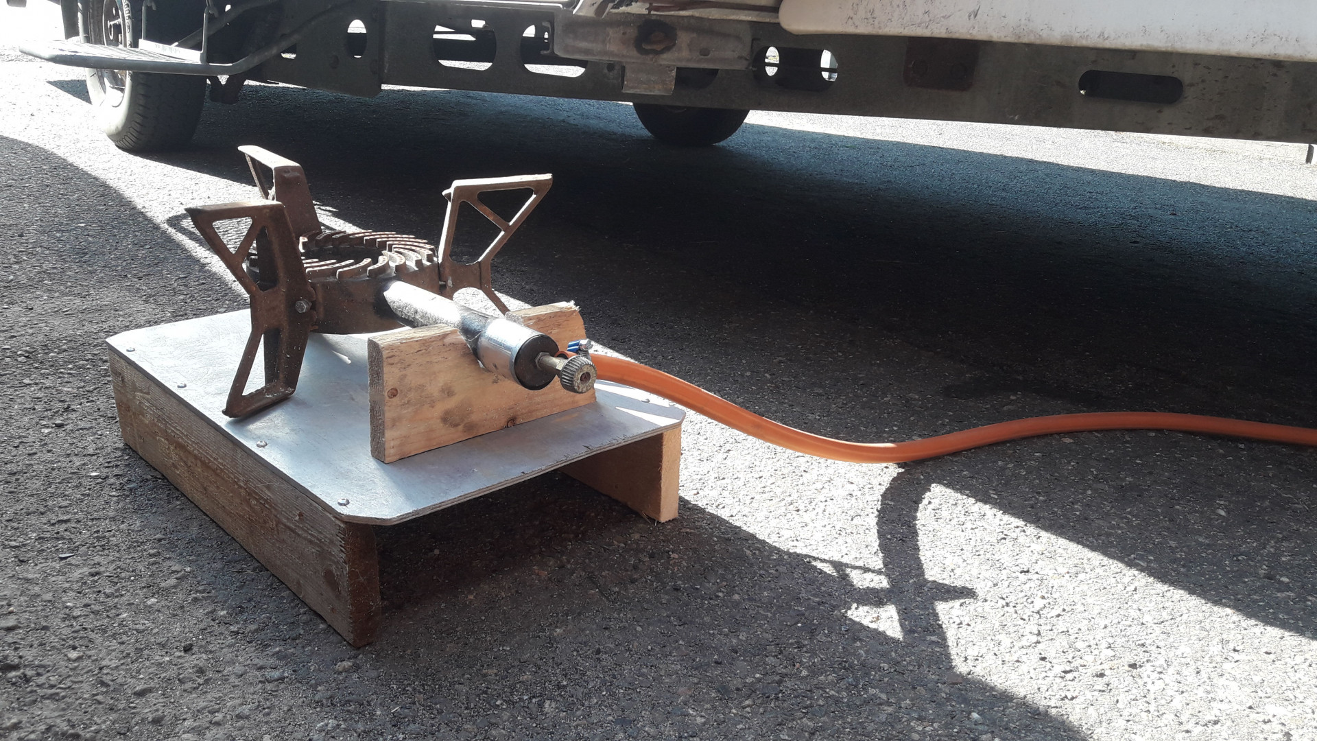 Akku poraan pätkäsin vanhasta saksitunkin veivistä sopivan varren ni saa tassut pikana alas ja ylös. Kaasupullot vaihettu täyteen. Toinen rauta sivuventtiilillä jääkaapille ja toinen komposiitti painoventtiilillä ulko grillausta varten johon hain uuen letkun 2,5m ni ei tarvi joka välis liinoja aukoo ja pulloa nostella. Vaunun akun latausta aikani pähkäiltyä ja auton rasiaa tutkailtuani päädyin seuraavaan. Auton akulta 10a sulake, merkkivalollinen katkaisija vaihekepin viereen ja siitä rasialle. 2,5mm neliösellä piuhalla vapaaseen nastaan.