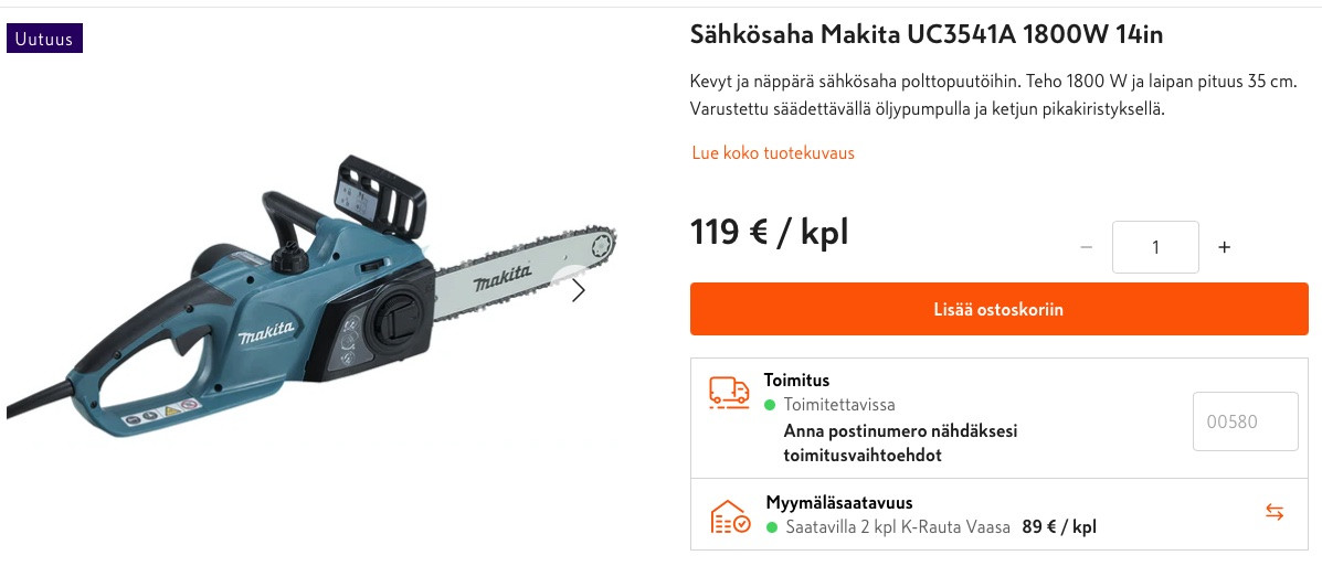 https://www.k-rauta.fi/etsi?query=MAKITA%20UC3541A tuolta kun ottaa myymälä saatavuus. Näkyy hinta vaihtelevan.