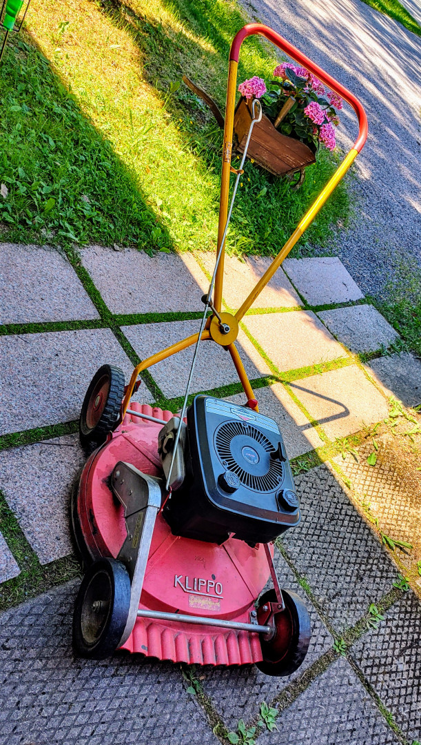 Taloyhtiön varastosta kaivoin vanhan Klipon esiin. Seissyt varastossa ainakin 10 vuotta. Olen nyt omistaja. Hyljeksitty vehje pienille nurmikoille, kun iso ja painava. Muistan kun taloyhtiön naisväki inhosi tuota. Minä tykkään, kun itsevetävä. Lähtee vaunulle koneeksi.