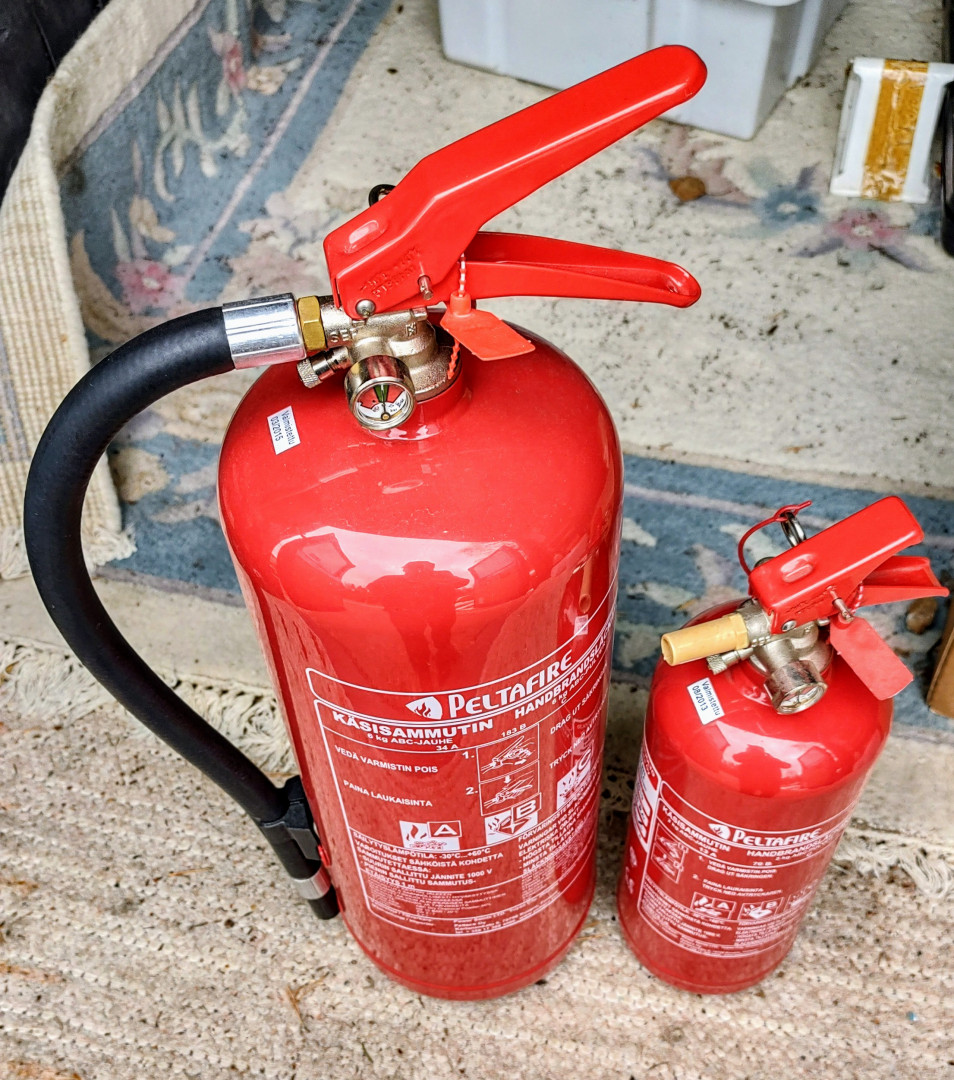 Uusi 6 kg nestesammutin on ostolistalla talliin. Vanha jauhesammutin täyttää nyt 10 vuotta. Olkoon sekin varalla. Kopautus kylkeen ja korva kiinni sammuttimeen, niin jauheen kohina pitäisi kuulua käännettäessä ylösalaisin.