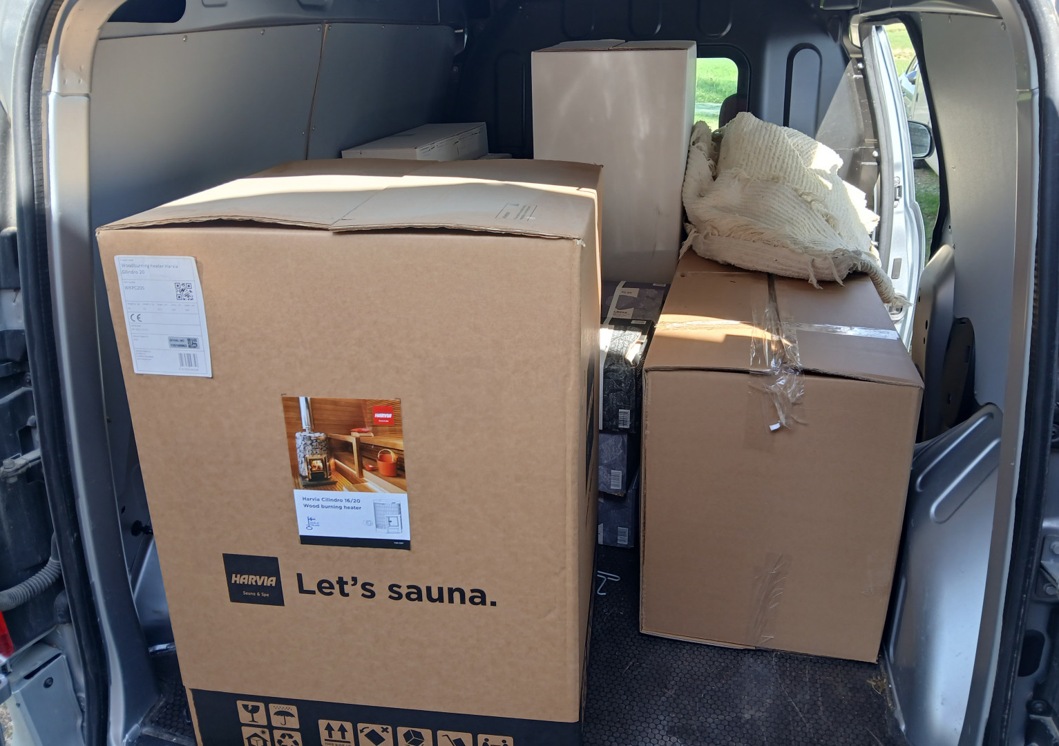 Saunan kiuas, piippuvesisäiliö, piippu, katon läpivientisarja ja kiviä 140 kg ;)