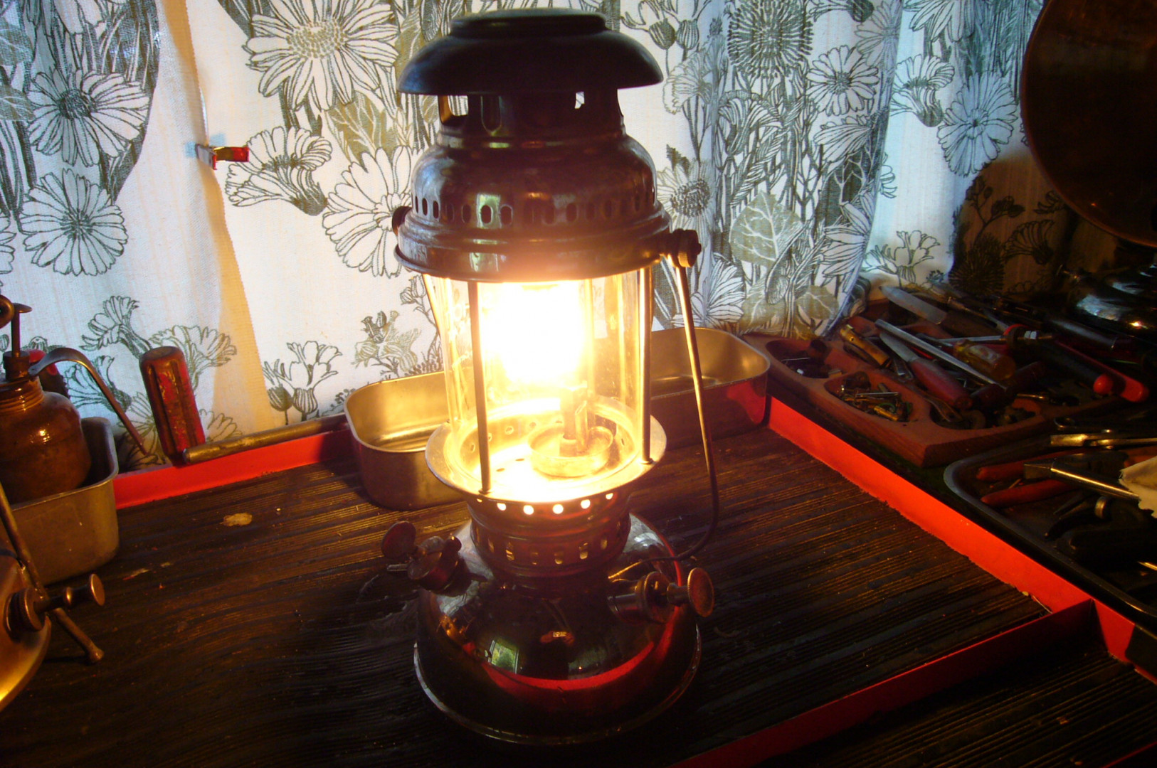 Valonlevittäjä olkoon tänään, ei petrovehje, vaan lyijyttömällä bensiinillä toimiva amerikkalainen Colemann Kätevä sytyttää, ei esilämmityksiä. Sen antama valo ei ole niin voimakas kuin petrovehkeiden mutta valo on mukavan pehmeä jota tehostaa vielä varjostettu lasi. Laite on valmistettu 1990-luvulla.