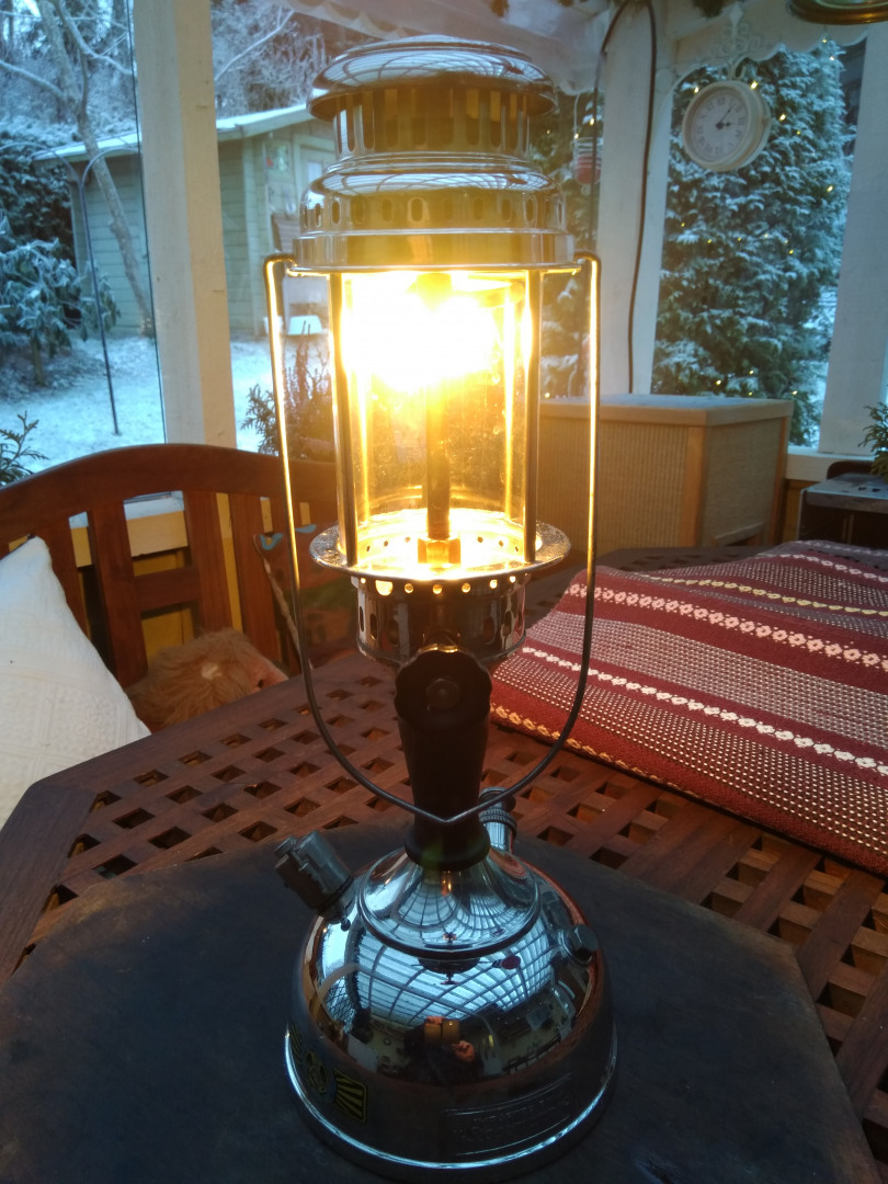 Tässä sitä aamun avausta tulikin.  Petrooli palaa tuulessakin.  Sellaista tuiskua,  sadetta tai myräkkää ei ole kohdalle sattunut,  että voimavalo olisi hyytynyt.
