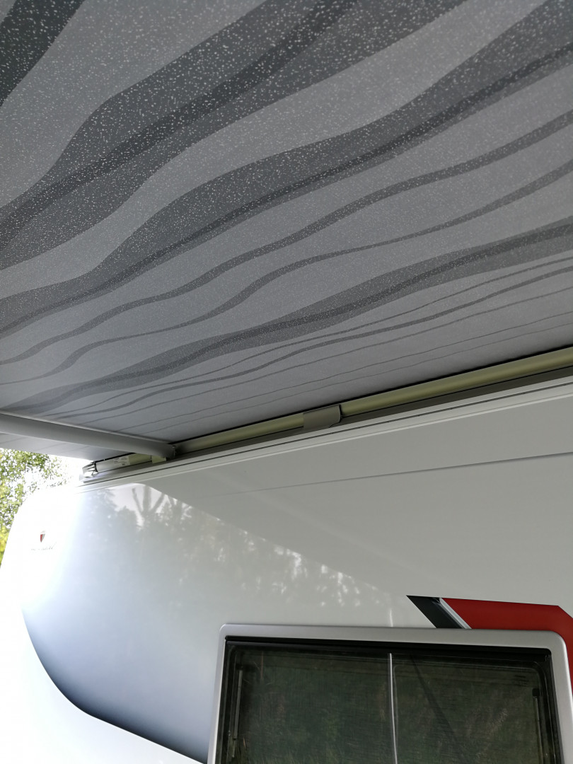 Voi olla, että menee vaikeaksi käyttää. Syynä se, että kotelomarkiisi on asennettu oven yläpuolelle, niin että ovi vielä aukeaisi markiisin alla. Mutta toisaalta vaunuissa ei yleensä oven yläpuolella ole 20cm enempää seinää katon välissä - markkisikin reilu 10cm korkea. Lisäksi kotelo tulee vajaa 10cm ulospäin. Siihen jää sellainen yhtälö, että vaikka telttauraan saa vielä jotain ujutettua, menee homma niin raskaaksi toteuttaa/vaati useampia apukäsiä. Voi olla, että koteloon on vielä laittettu se tiivistelista sinne yläsaumaan, niin se voi jo käytännössä syödä sen muutaman sentin varan uran edestä.