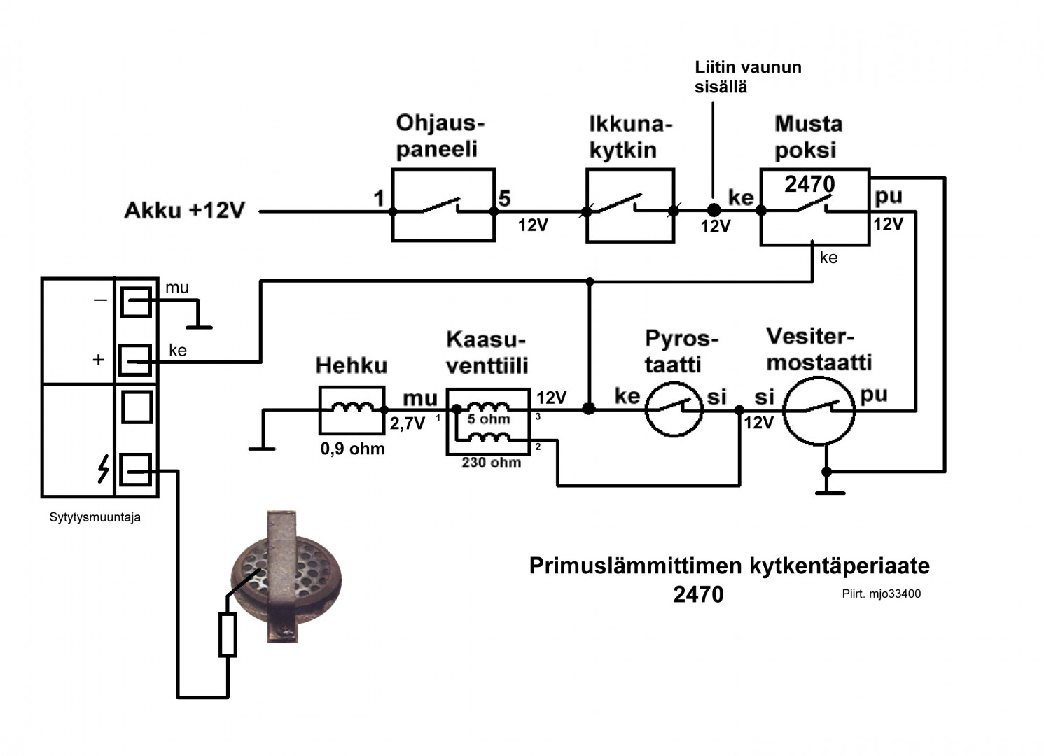 Voiko mun magneettiventtiili olla joku ihmeen peilikuva. Joka paikassa on nyt minun käsitykseni mukaan kaikki kytketty oikein, mutta: 1) jos kytken maajohdon ja kipinäboksin mustan johdon vesitermostaatin maaliittimeen, magneettiventtiili aukeaa, mutta kipinä lakkaa 2) kun irrotan nuo johdot vesitermostaatilta, magneettiventtiili menee kiinni ja kipinöinti alkaa Laitoin sitten kaikki johdot paikoilleen, mutta otin hehkun johdon irti magneettiventtiilin ruuvin alta. Mittasin jännitteen hehkun johdon ja maan välillä: 12V  Hehkun johto siis lyö pöntön runkoon +12V, jolloin tietenkään kipinäkärjen ja rungon välillä ei tapahdu mitään. Mittasin sitten vastuksen magneettiventtiilin napojen välillä: KELTAINEN <-> MUSTA 5 ohmia KELTAINEN <-> SININEN 230 ohmia SININEN <-> MUSTA 222 ohmia Nyt elektroniikkaihmise t: mikä on johtojen oikea järjestys, eli minkä napojen välillä kuuluisi olla mikäkin vastus? Vai onko johdot oikein, mutta hehku pitää korvata jollain vastuksella magneettiventtiilin ja rungon välillä? Oli pakko siirtää tuo johto suoraan runkoon, kun hehkusta on lanka poikki... Vai onko magneettiventtiili viallinen?