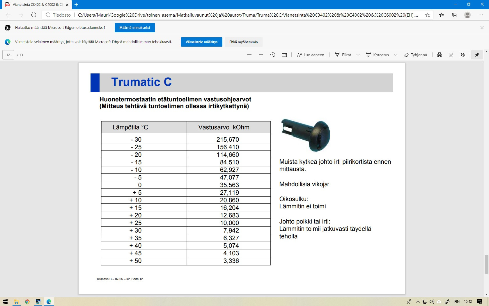 Mittasin myös anturia, joka näytti varmaan jotain 9,6 k kun lämpötila oli sisällä n 26 (auto pihassa auringossa) siitä tuulettamalla lämpötila 21 paikkeille, jolloin mittari näytti 12,jotain. Eli tuo näyttäisi taulukon mukaan linjassa olevan ja kunnossa.