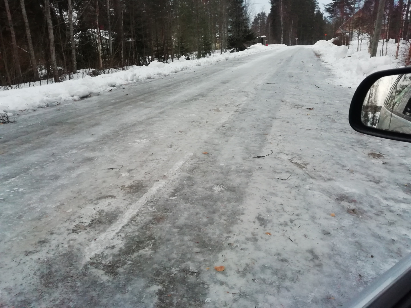 Tosin on kyllä niin likkasta että oma auto nastoillakin liukui poikittain parkkipaikallamme, joka neämmä ei siis ole ihan vatupassissa. Vaihdoin pikaisesti talliin ennen kuin joku parkkeeraa viereen. Lauantai-illalla kun kiersin talon niin yhdestä mutkasta mentiin myös silloin penkkaan. Vauhtia ei ollut nimeksikään, muttei vaan kääntynyt vaan meni sinne minne tie viettää. Peruuttaen ja kääntäen sai keulan käännettyä alamäkeen ja pääsi jatkamaan. Onneksi tuossa alamäessä oli pitävämpiä kohtia, niin ei mennyt ihan suoraksi.