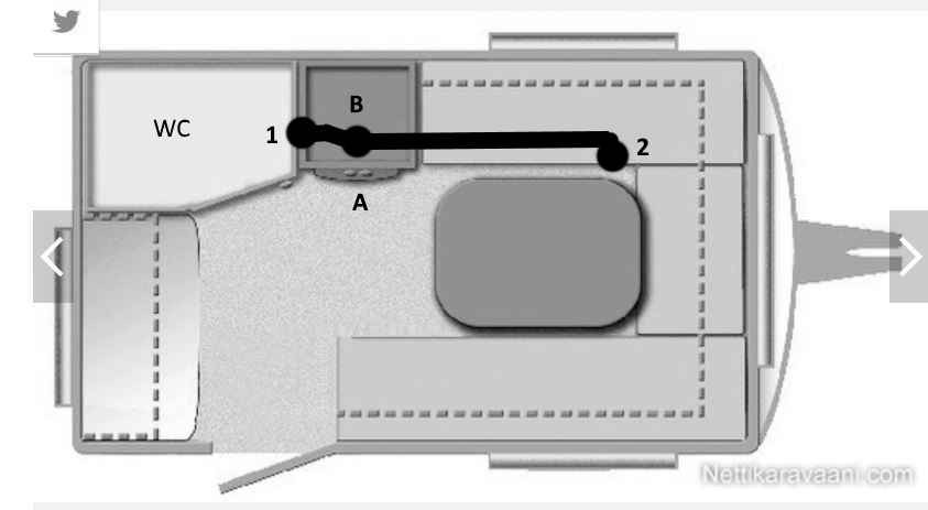 ^ Hyvin samaan tulokseen pääsee varmaankin seuraavan kuvan mukaisesti.  Siinä reijitetty putki kiertää sohvan etureunassa lattialla estäen kylmän ilman valuvan pöydän alle seinien vieressä olevista raikkaan ilman tuloaukoista. Tässä syntyy myös "jonkinlainen" lämpimän ilman sekoittuminen kylmään ja nousu solasta ikkunoiden luona ylös. Sivuseinillä sijaitsevat pyöräkotelot, kaapelit ja etuseinällä akku + laturi sekä etupoksi. Näin säästetään putken pituutta ja saadaan yksi lisäsuutin ovelle. Lämmitin vaunua +4 asteen lämpötilassa eilen ja lämpötilaero oli todella suuri lattian ja katon välillä. Ja WC oli tosi viileä.