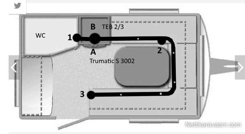 Ok, pitää valita sellainen vessan suutin, jonka virtausta voi säätää hyvin pieneksi. Pääsäätönä lienee kuitenkin tuo Airmix ilmanjako Trumaventissä. Pääosa ilmasta suunnataan asuinosaan ja vain pieni osa vessaan.  WC:ssä on oltava lämpöistä, koska siellä istuskellaan joskus pitkäänkin housut nilkoissa.  Trumatic S 3002:n ongelmana on, ettei se osaa sammua ja käynnistyä automaattisesti ulko/sisäilman lämmön vaihtelun mukaan. Tässä kyseisessä lämmittimessä käynnistys tapahtuu kuitenkin helposti vain nuppia kääntäen ja painaen. Ja sammuttaessa ei tarvitse edes painaa. Tuota pitkää putkea sohvan alla tuskin reijitetään koko matkalta, koska siellä säilytetään petivaatteita ja muutakin (kevyttä) vaatetavaraa pidemmillä reissuilla.