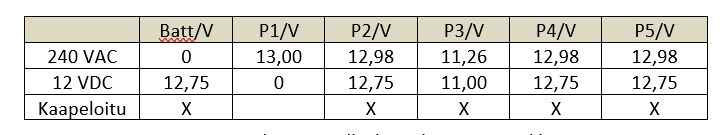 240V.n Jännitteet mitattu yleismittarilla ilman kuormaa, akkua, ja laturia. 12V:n jännitteet ilman verkkovirtaa, kuormaa ja laturia. Akun jännite 12,75