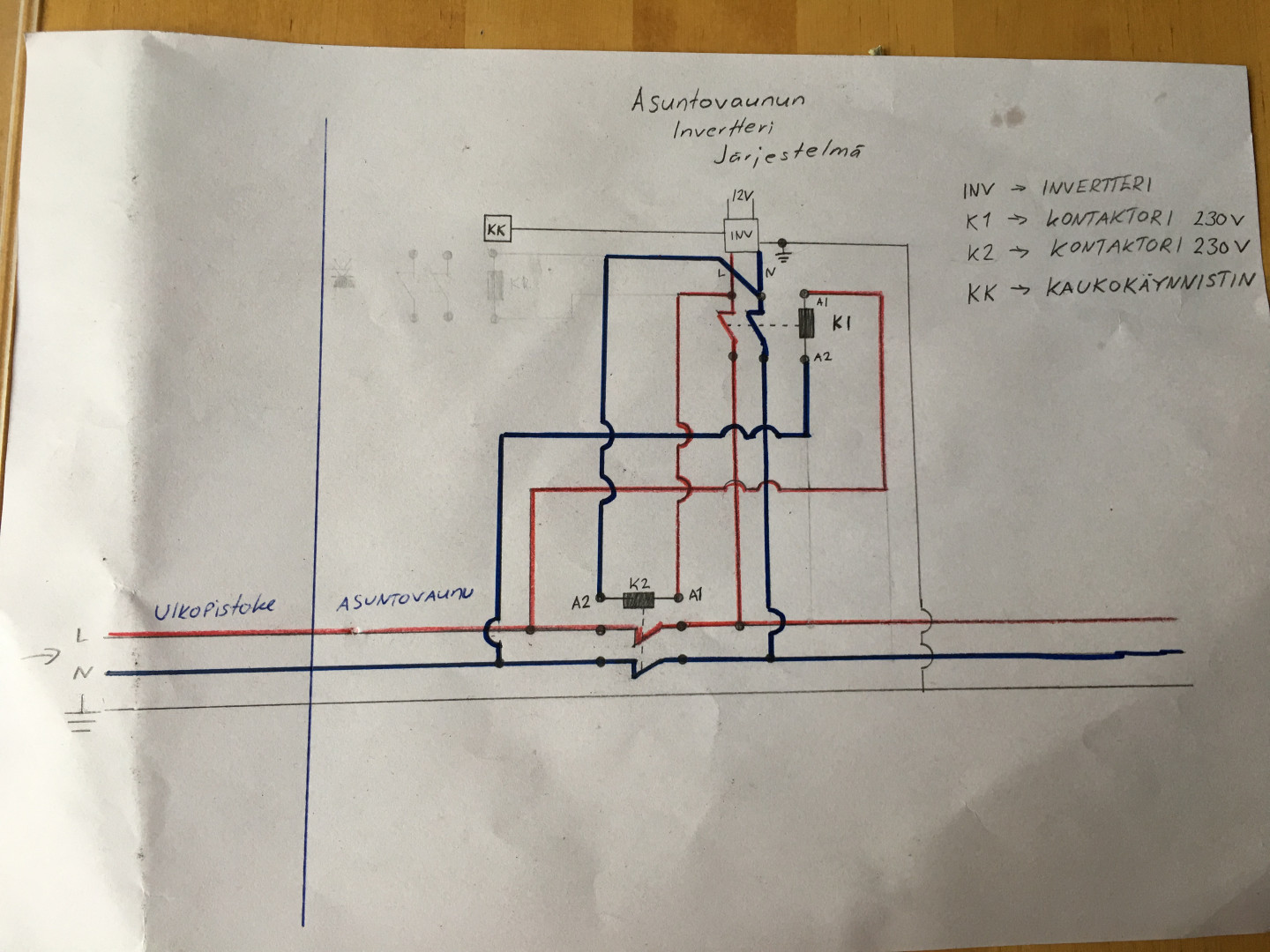 https://www.ebay.com/p/DC-12v-to-24v-Step-up-Converter-Regulator-10a-240w-Power-Supply-Adapter-for/1080042936?iid=233101659798 tuo ehkä vois auttaa ajonaikaiseen lataukseen. En tiedä. Tämmöisen aikani kuluksi piirtelin ja tässä olisi se tarkoitus että ulkopistorasiaan ei tulisi virtaa invertterin ollessa päällä. Muuten voi olla vähän vaarallista jos "joku" päättää avata suojaluukun ja koskea paljaisiin päihin Eikös yksi vaihtokärkinen rele olisi kätevämpi? Samalla tulisi estettyä tuonkin kytkennän pikku ongelma eli releiden ehkä erilaiset kytkentäajat. Ja jos on vielä apukärjellinen rele, niin apukärkien kautta sit invertterin sammutus ja käynnistyksen esto kun seinään tulee sähköä. JOs siellä on verkkolaturi, niin se olisi kans hyvä irrottaa intikasta.