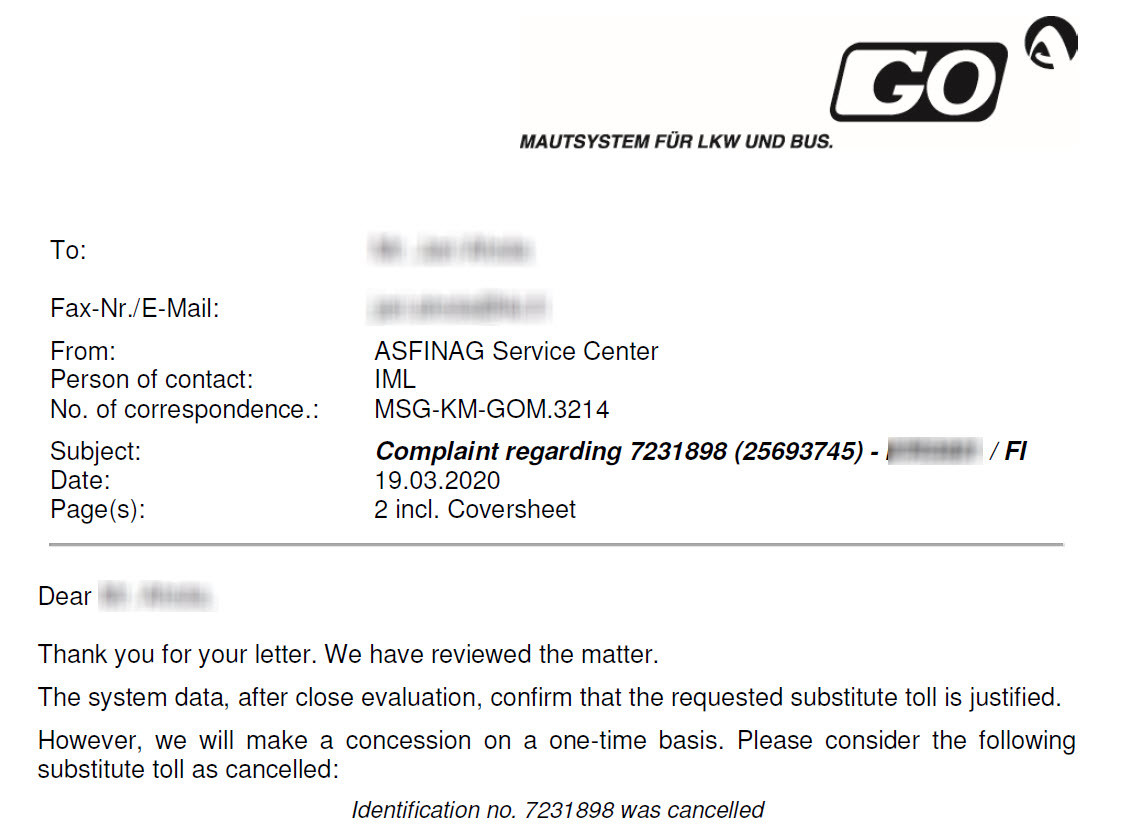 Avasin Asfinag'ista pe tullee kirjeen - jotenki muistelinkin nimen liittyvän Itävallan tietulleihin, enkä heti nakannut (avaamatta) kierrätykseen kapeaa rahankerjuu kuorta.. Sisällä oli 240€ lasku...  Joku vajaa 0.5€ tieosuus oli jäänyt veloittamatta. Ennen ja jälkeen veloitukset go-boxilla samaisena päivän oli mennyt. Samoin kuin päiviä ennen ja jälkeen. Myöhemmin lisälatauksen yhteydessä ei mitään puutteita, eikä myöskään go-maut.at portaalissa näkynyt silloin eikä nyt. Laitoin vastineen heille.. Liekö joku huijauskirje kun ei kunnon laskulta näytä. Iban ja bic numerot on, mutta ei tilinhaltijasta parempaa
