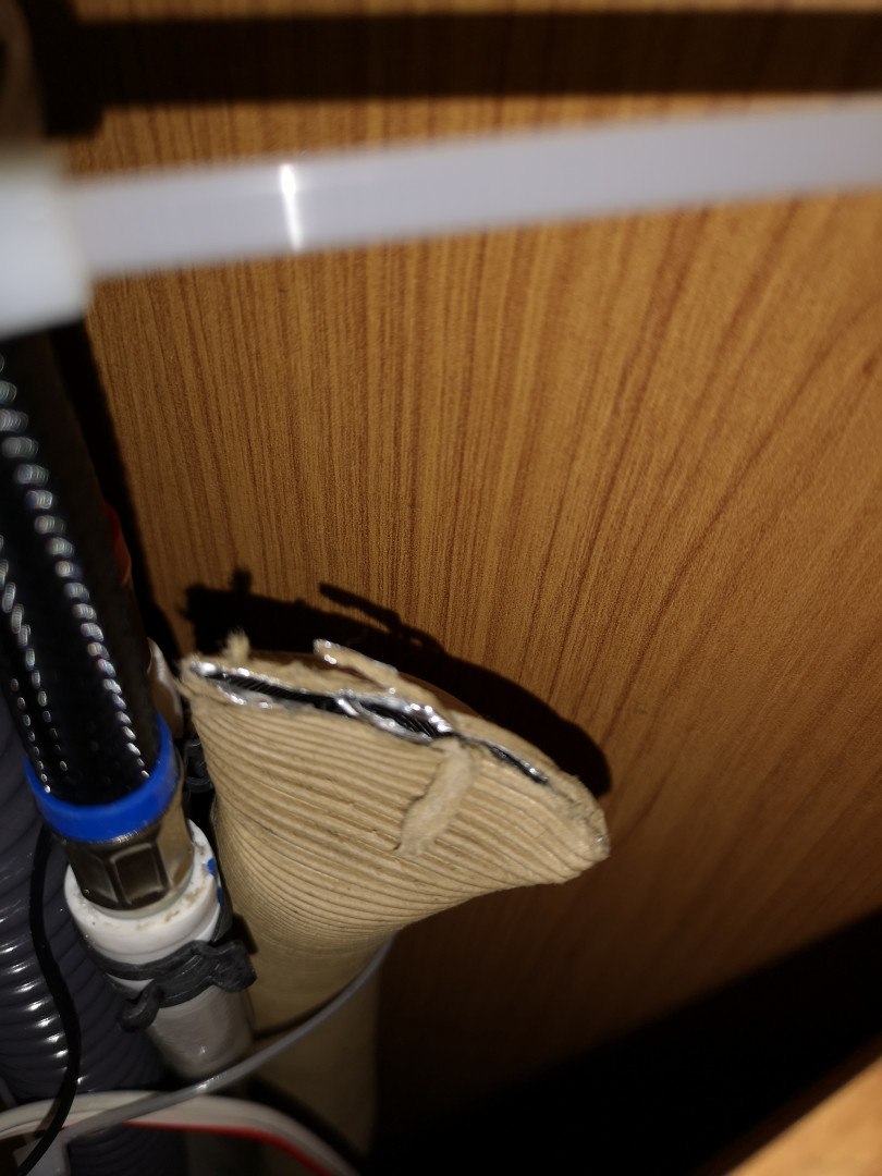 Kiitos taas. Jatkuvasti näyttää tulevan opittavaa. Tarkastin putken ja noin juuri putkessa kolmion muotoisia reikiä eri kohdassa putkea. Putki nousee vesiputkien kanssa ylös ja ennen viimeistä hyllyä pää lytätty kiinni.  Thumb
