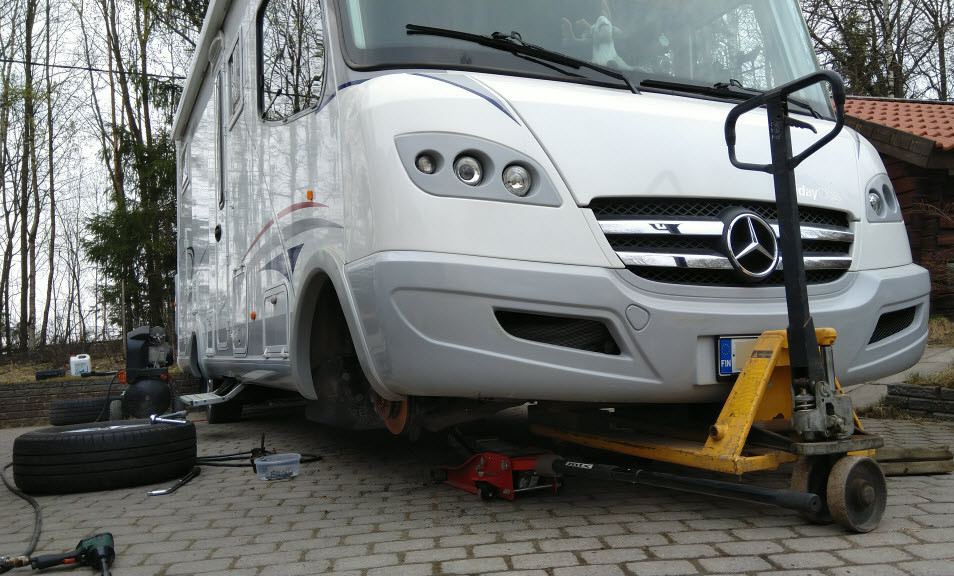 Itselläni on Puuilon 6 t:n tunkki. Sillä nostan pyörä kerrallaan. Kaikkea sitä on taas keksitty höyrötystä pyörän vaihtoon.  ::)