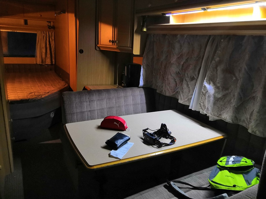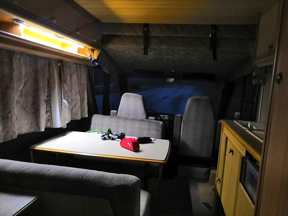 No niin, minä ku vietän aina la- su yön valvoen niin nyt lähdin sitten yöllä 3 aikaan käymään tallilla, kävin tankkaamassa auton ja heitin sillä noin 50km lenkin ja pysähdyin hetkeksi autoa tutkimaan ennen kun menin takaisin tallille ihmettelemään lisää! sisävaloista suurin osa toimii ainakin 12v:lla mutta siis pitäisikö valojen palaa myös nollaasennossa kun auto on kytketty seinään? Pistorasiat myös toimivat hienosti  Thumb Tosin niitä olisi saanut olla vähän enemmän mutta noillakin kyllä pärjäilee. Muutama kuvatus tähän sisävalot päällä  :laugh: Vielä en uusia petivaatteita ehtinyt laittamaan mutta jos sit tiistaina kun ajattelin koko päivän vietellä tallilla=)