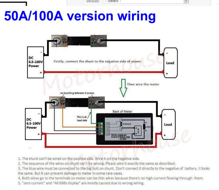 Tämän jälkeen kytket mittarin. Shuntilta pienemmistä ruuveista mittariin kaksi johtoa kuten linkkisi kuvassa on kytketty (50A/100A version). Jos mittari ei näytä mitään kulutusta, johdot ovat väärinpäin, vaihda toistepäin, ei käryä.
