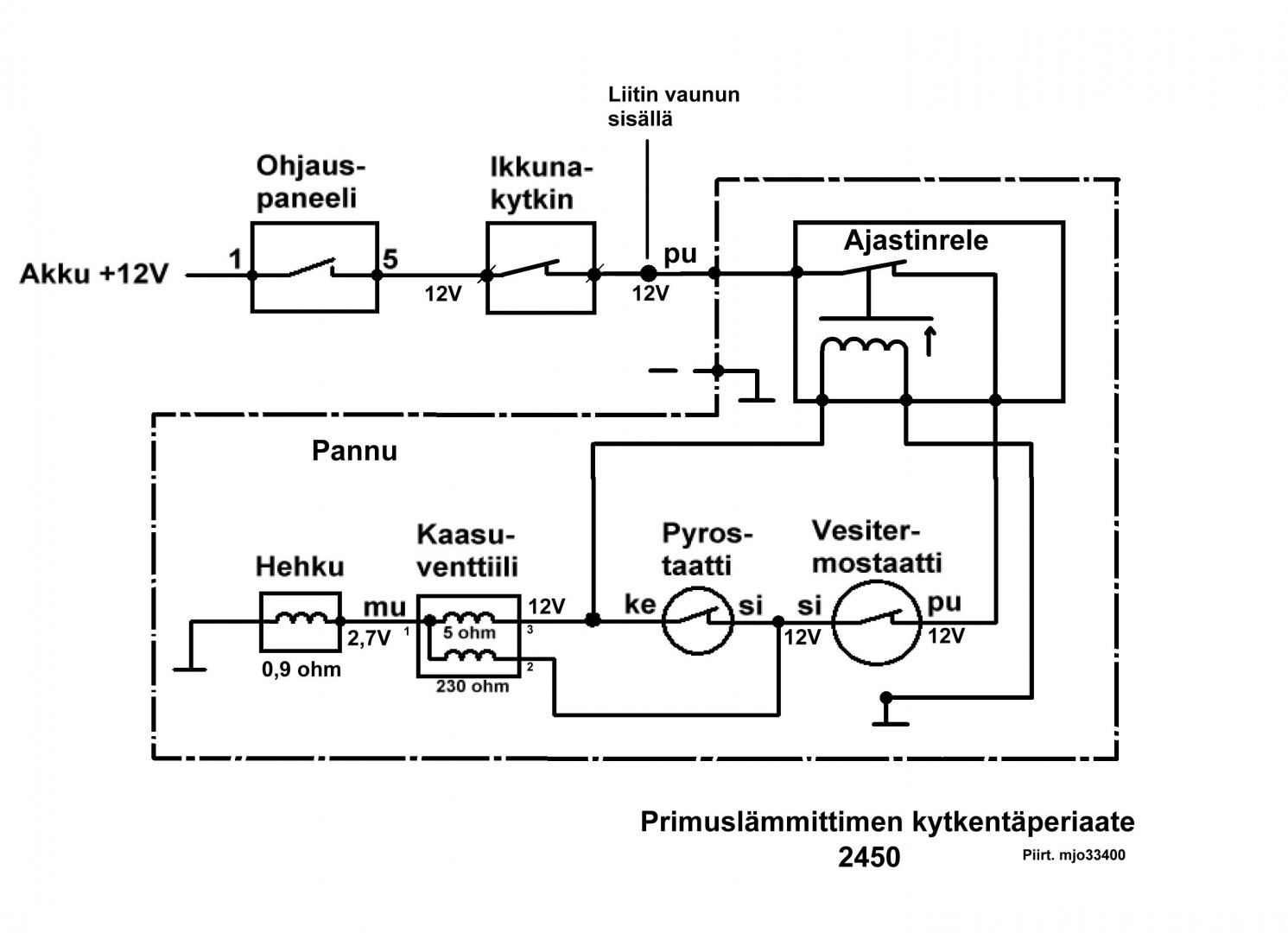 Minä mjo irroitin ajastimen kokonaan pannusta irti ja syötin jännitteen suoraan akulta kun sattuu olemaan sellaiset irto johdot ja mittasin sitten mitä niistä ajastimen kahdesta nastasta tulee ulos kun syöttää jännitettä(keltainen joka menee pannun kytkennässä pyrostaatille ja pun nasta ,joka menee vesitermarille ja pumpulle,niin punaisesta nastasta tuli se 12v vähän yli ,mutta keltasesta tuli ulos vain vähän 0.0 5v onko jotain mätää ajastimessa ,oman käsityksen mukaan siitäkin keltaisesta nastasta pitäs tässä tapauksessa tulla se sama 12v ,saatan kyllä olla väärässä tässäkin,eikä se ole ainut asia ,myös se kummastuttaa että miten se lähtee edes kerran käyntiin,voihan se pyrostaattikin olla sökö,mutta irrotettuna ja kylmänä nastoista piippaa kuitenkin,että ei ainakaan ihan katki