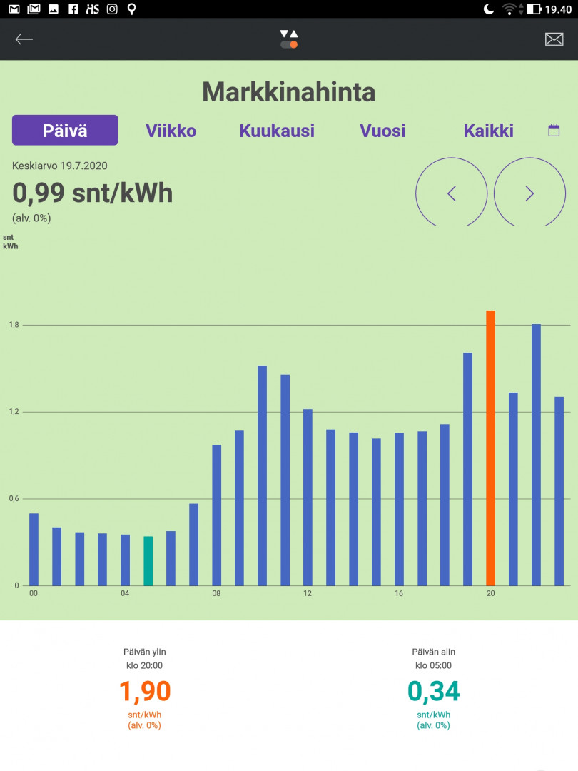 Yhtenä iltana tuli mieleen pörssisähkön hinta. Kun varsinkin näin kesäaikaan väkisinkin jää energiaa myytäväksi, niin kannattaisi keskittää esim. pyykin pesu lauantaiksi ja/tai sunnuntaiksi. Silloin myydystä energiasta saa huonomman hinnan kuin arkena. Kuvissa perjantain ja sunnuntain pörssisähkön hinnat tunneittain.