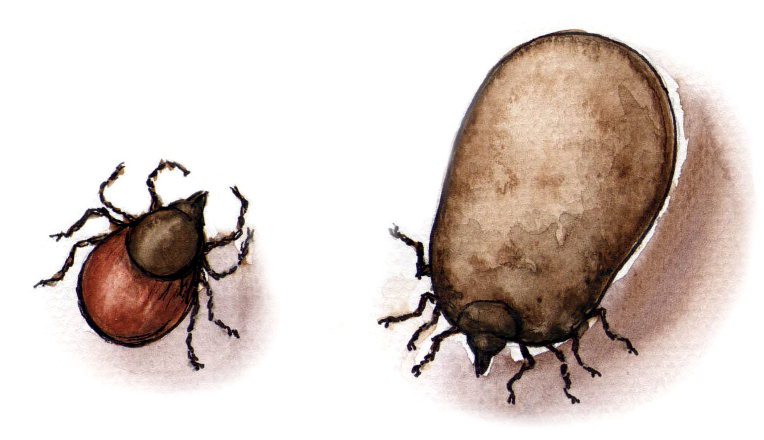 Ja viksut vastaukset Meillä punkkien poiston tekee rouva omalla tehokkaalla tyylillään, eikä mitään komplikaatioita ole tullut. Hän tunnustelee punkkia pinsettiotteella ja hyvän tuntuman jälkeen nyppäsee punkin kohtisuoraan pois. Pitkäkarvaisen koiran turkin karvojen sisään ei edes aina näe riittävän hyvin. Sormet tuntevat paremmin kuin pinsetit. " Sitten otus asetetaan selälleen kovalle alustalle ja litistetään kynnen ulkopinnalla. Tappamisen hän suorittaa kylmän rauhallisesti ja kyynelehtii vasta myöhemmin kainalossani. Ennen sormet disinfioitiin koskenkorvalla mutta nykyisin kirpaisevalla käsidesillä, sillä viina on loppunut. Koira ei ole toimenpiteestä moksiskaan, sillä se saa pienen namupalan toimenpiteen jälkeen  " Koiralle kammataan jakaus niskaan ja karkotinliusta pipetoidaan n. 5 cm:n pituudelta. Se vähentää punkkien ym. ötököiden puremia ja jos joku erehtyy imemään verta, se kuolee ja kuivahtaa aineen vaikutuksesta nopeasti.  Kuvassa nälkäinen ja kylläinen punkki (rouvan akvarellipiirros)