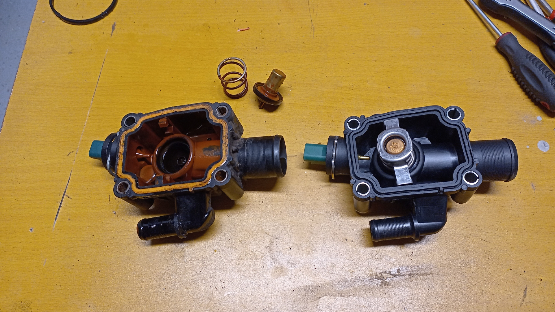 Tuosta pesusta. Viime viikolla 307 pösöstä pesin laimealla oksaalihapolla jäähdytysjärjestelm än. Ennen pesua huuhtelin vedellä sen verran että sai glykolit pois koneesta ja loppui ruosteveden tulo jonka jälkiin laitoin puoleksi tunnksi hapot sisään. Jälleen tuli aivan ruskea vesi koneesta. Muutaman kerran huuhtelin moottorin puhtaalla vedellä ja kauan sai painaa pelkästä jäähdyttimestä vettä läpi ennenkuin loppui ruoste veden tulo. Myöskin paisarista pesin ruskean moskan pois ettei mene enää uudelleen jäähdytysjärjestelm ään. Uusia nesteitä sisään kaadellessa nesteet meni huomattavasti nopeammin koneeseen eli ilmeisesti on jotain tukosta ollut. Termostaatilta ilmausruuvi auki niin suhina kuului kun ilma poistui ja paisarissa nestepinta laski selvästi kun ennen pesua vastaavassa kohdassa pulputteli vain hitaasti. Sitä en osaa sanoa että vaikuttiko sisälle tulevaan lämpöön kun en tällä kerennyt nyt kylmemmillä ilmoilla ajella kun ollut tovin telakalla eikä hirveästi lämpöjä vielä kesällä tarvinnut. Kuitenkin nyt mitä ajellut niin melko pian tuo lämmintä puhaltaa sisälle kun termostaattikin on nyt kunnossa. Vanhasta termostaatista näkee minkä näköistä oli koneen sisällä  Vesipumpun pesä pesun jälkeen. Oli samanlainen ennen pesua kuin tuo termostaatin pintakin.  Tästä ainakin voin ite päätellä että ei tuosta ainakaan haittaa ollut.