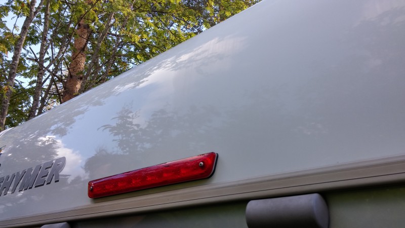 Perän valkoista osaa. Vasen puoli pelkän myllyn jäljiltä, ei vielä vahaa pinnassa. Pinta näytti ihan hyvältä ja valkoiselta ennen myllytystä. Se on pesty oikeen kunnolla Autoglymin Caravan&Motorhome cleanerilla ja vielä shamppoolla harjan kanssa. Se oli vaan niin tasaisen pinttynyt matta ja katolta vielä valumia.