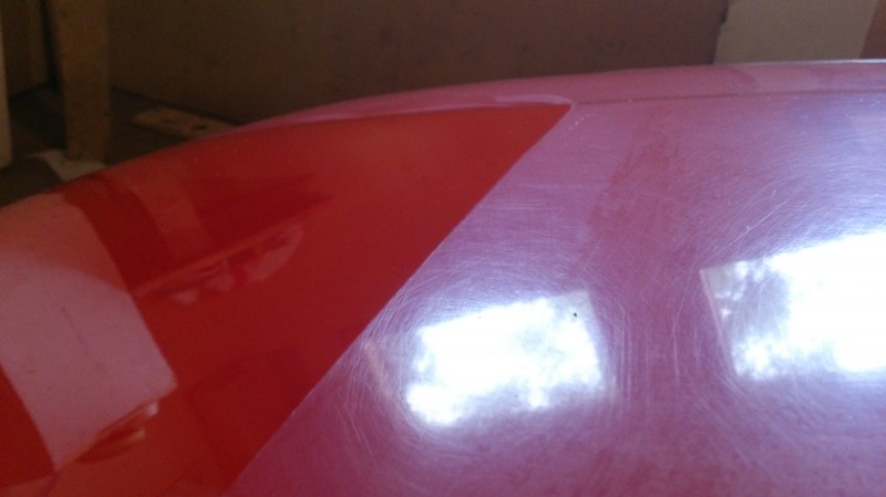 Laitetaanpa vielä kuva rouvan kesäauton konepellistä. Teipillä rajattu ja toinen puoli myllytetty, ei edes vahaa vielä pinnassa! Näyttää aivan maalatulta.  :o