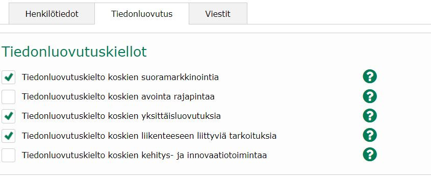 Kävin muissa asioissa Trafin sivuilla. Sattumalta samalla huomasin, että omissa tiedoissa voidaan kieltää ko. asioita: