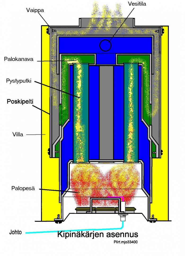Tässä kuvia. Eli 14x1,5 haponkestävällä putkella lämmönsiirtoputket ja vesipuolella ohjauslevyt, jotka kierrättää vesiglykolia siirtimen läpi. Savukaasut menee suoraan siirtimen läpi.