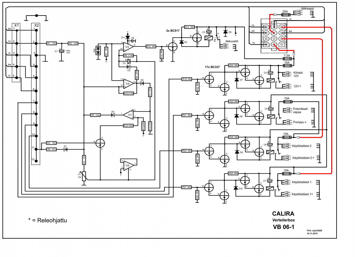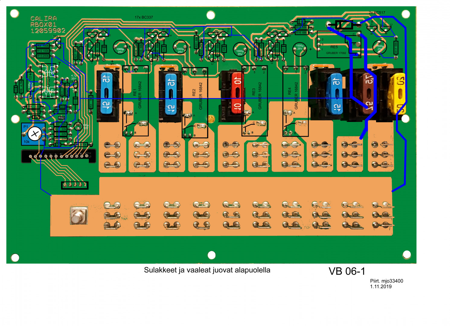 Tässä kyseisen poksin kytkentäkuvat. Sulakkeet ja vaaleat juovat näkyy läpi.