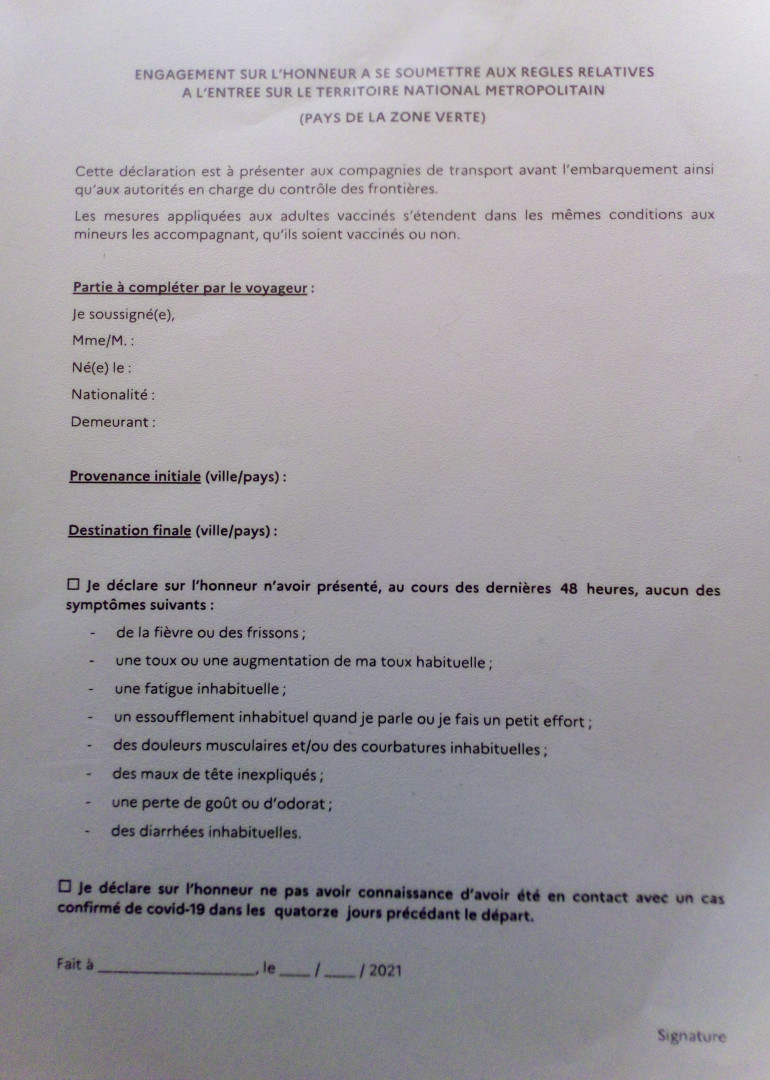 Ja ranskassa on oltava tämmöinen paperi täytettynä covid todistuksen lisäksi.