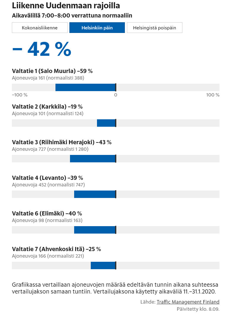 Vaikka rajat olleet auki, ei aamun arkiliikenne vain vastaa aikaa ennen epidemiaa. Ei tartte kulkea työmaalle kun talous yksii, ei ihmiset.. Tänään näin:
