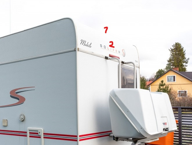 Peruutuskamera pitäis laittaa paikoilleen mutta kysytääs mielipidettä kannattaisiko se asentaa katolle tuohon kuvan kohtaan 1 vai tuohon pystysuoraan kohtaan solifer tekstin yläpuolelle kuvan kohtaan 2? Vai kenties johonkin muualle? Tuossa on tuo kuljetusboxi joka varmasti tulee kuvan eteen mutta sille ei nyt tietenkään voi mitään.