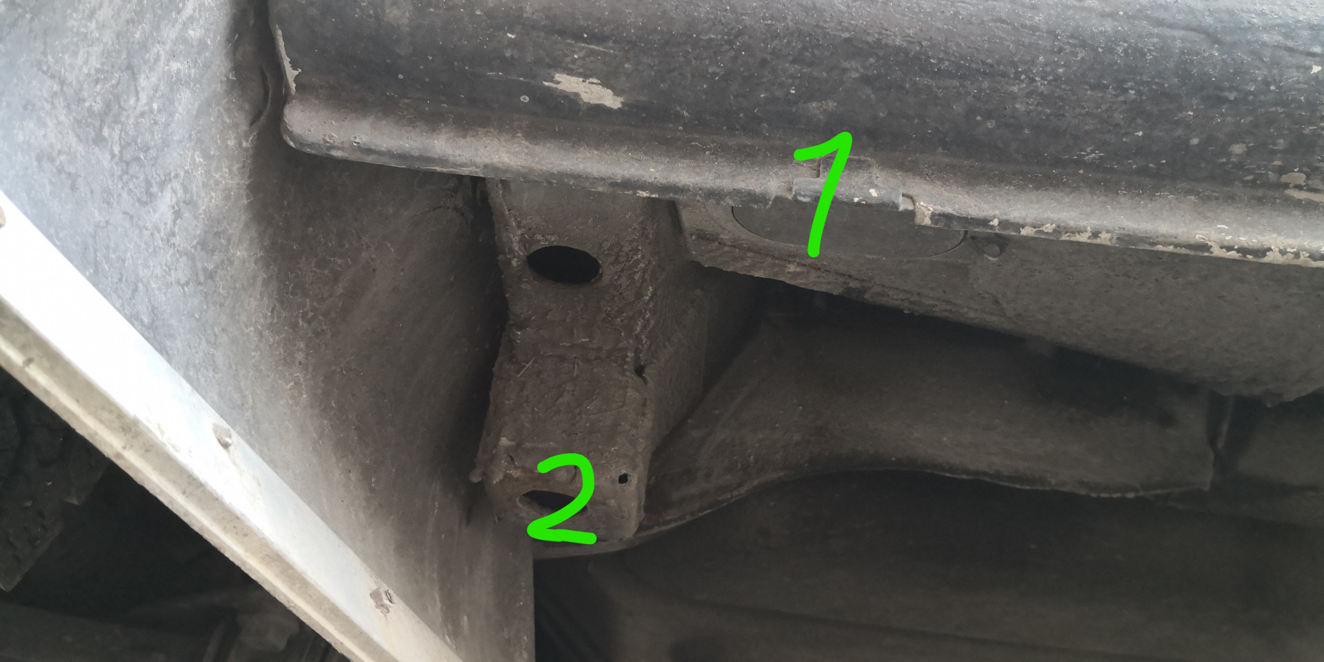 Tässä kuva eturenkaan takaata. Yleensähän henkilöautossa on nostokohdat hyvin näkyvissä mutta tuosta ei nyt heti aukene mistä kohdasta on hyvä nostaa? Kohdasta 1 ei ainakaan koskaan ole tuota nostettu mutta eipä näkynyt nosto jälkiä missään muuallakaan.