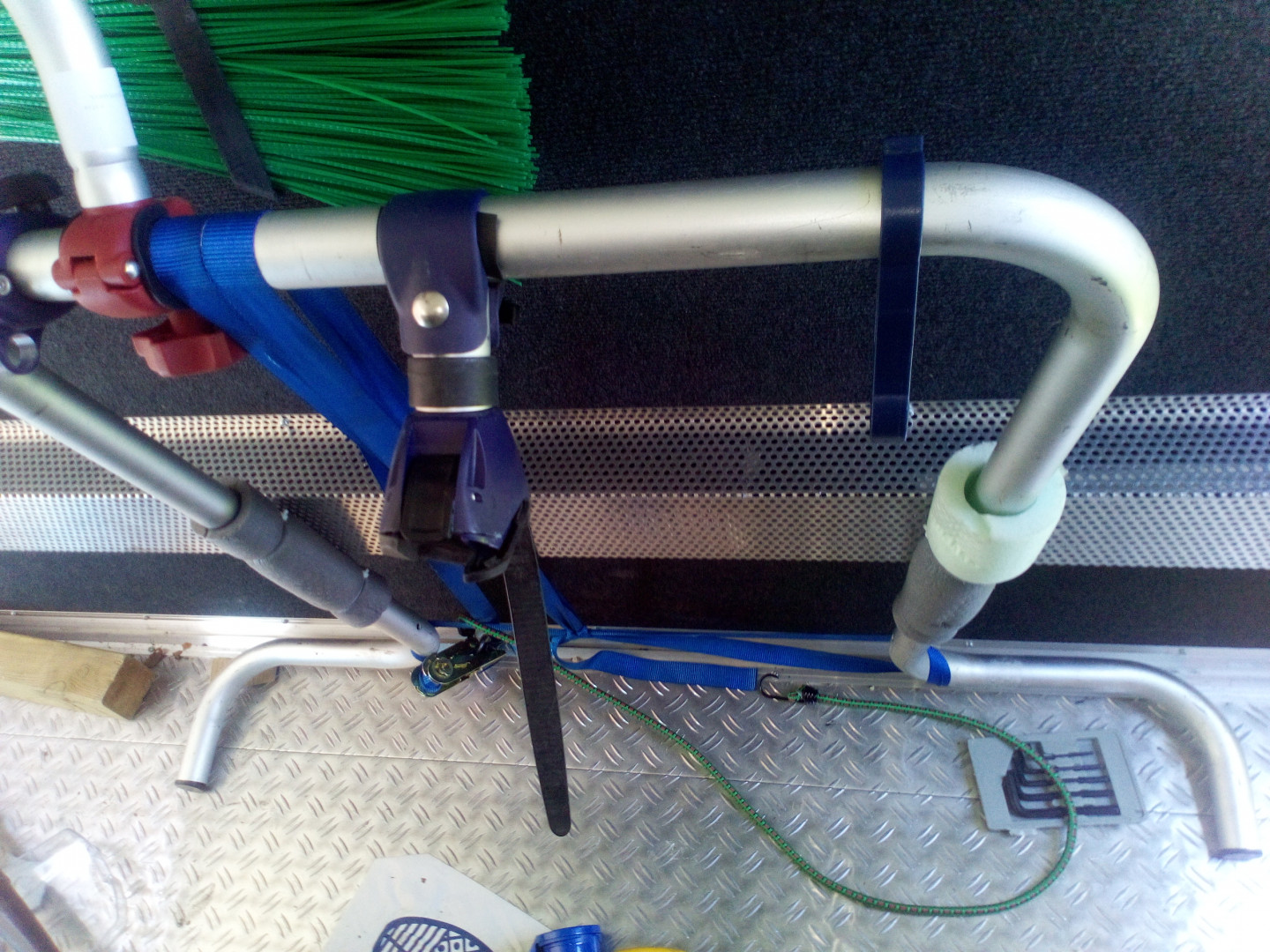 Seinässähän se ei kiinni ollenkaan. Normaalisti kiinnitys on neljä kourua ruuveilla lattiaan tuosta mutkan molemmin puolin , kuvassa käden vieressä. Minulla se on kiinnityskiskossa liinalla.