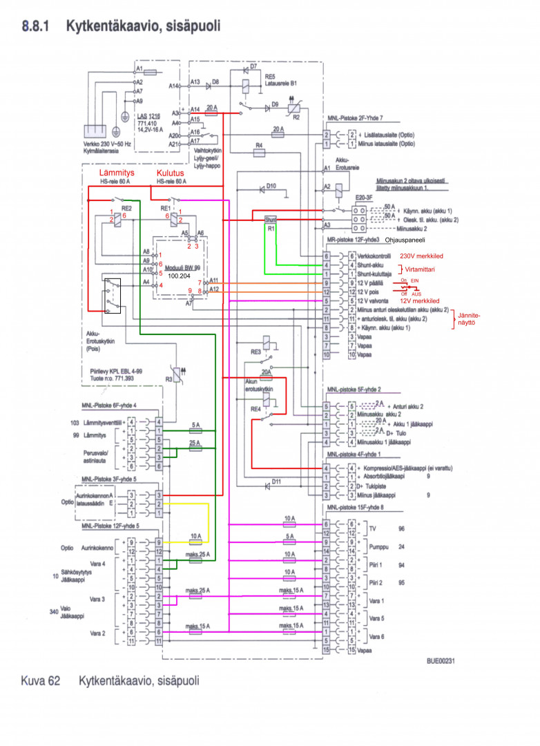 Hevosmiehen kuvaama kytkentä siellä on ihan Schaudtin tekemänä - katso kuva - mutta kun tässä tapauksessa on ykkösblokin ykköspinni vedetty pois, katkaistu ja vedetty sulakkeen kautta asunto-osan akulle. EBLn releet on mitattu ja toiminta kokeiltu penkissä D+ suhteen, toimii, eli sen ei pitäisi olla syy ohitukseen. Onko Hymereissä D+ kytketty jääkaapille vai luotetaanko tähän kytkentään, omassani tulee jääkaapin rimaan jälkeenpäin vedetty (ei minun vetämäni) D+ mutta se ei mene jääkaapille, sen sijaan kaapin "Engine" johto on vedetty yhteen rimalla "12V" -johdon kanssa ja siitä tuohon edellämainittuun asunto-osa-akun kytkentään. Kaappi on Thetford N145 vanhimmalla piirikortilla. Jotenkin vaikutta siltä että on joskus ollut ongelmaa jääkaapin kanssa ja on tehty jotain pielavetisiä kytkentöjä että saadaan pelaamaan edes jotenkin, sehän vaatii tuon 12 volttia toimiakseen alkuunkaan, edes kaasulla tai maasähköllä.