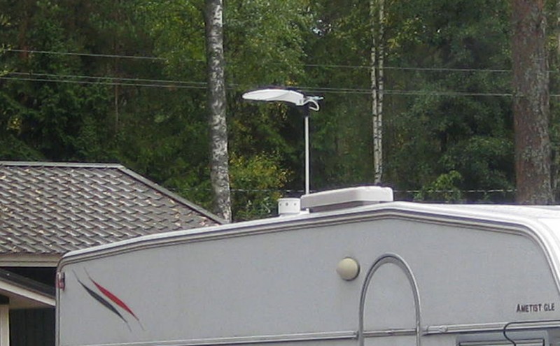 Käytössämme on Triaxin Ufo 120 (ero 100:n on kiinnitystarvikkeis sa). Valamon luostarin parkissa ei kaikkia kanavia löytynyt., muuten Pohjois-Norjaa myöten kyllä. Tv:sa ei ole antennin jännitteen syöttöä, joten käytössä on erillinen IFP 529, josta on helppo ottaa myös radion antennisyöttö.